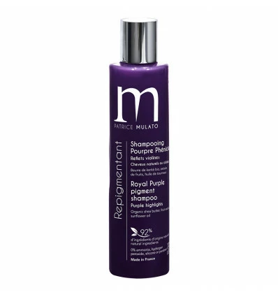 Shampooing Repigmentant Colorant Pourpre Phénicien Patrice Mulato 200ml : shampooing pourpre phénicien, reflets violines pour cheveux naturels ou colorés. Composé de beurre de karité bio, aux extraits de fruits et huile de tournesol. 92% d’ingrédients d’origine naturelle. 0% ammoniaque, eau oxygénée, silicone ou paraben.