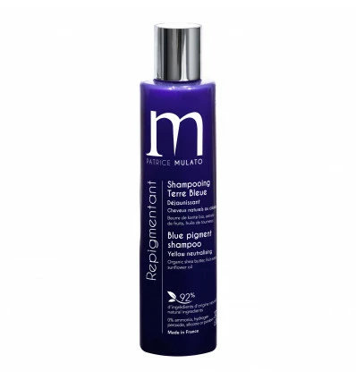 Shampooing Repigmentant Colorant Terre Bleue Patrice Mulato 200ml : shampooing terre bleue, pour cheveux blonds ou décolorés. Composé de beurre de karité bio, aux extraits de fruits et huile de tournesol. 92% d’ingrédients d’origine naturelle. 0% ammoniaque, eau oxygénée, silicone ou paraben.