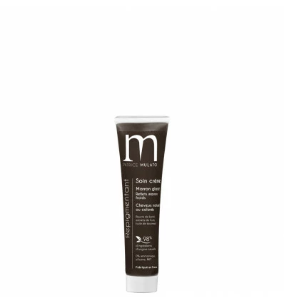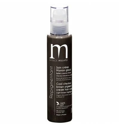Soin Repigmentant Marron Glacé Patrice Mulato : soin crème marron glacé pour cheveux naturels ou colorés, reflets marrons froids. Composé de beurre de Karité bio, aux extraits de fruit et huile de tournesol. 98% d’ingrédients d’origine naturelle, 0% d’ammoniaque, eau oxygénée, solicone et paraben. Fabriqué en France.