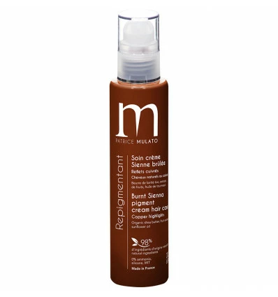 Soin Repigmentant Sienne Brûlée Patrice Mulato : soin crème sienne brûlée, reflets cuivrés pour cheveux naturels ou colorés. Composé de beurre de Karité bio, aux extraits de fruit et huile de tournesol. 98% d’ingrédients d’origine naturelle, 0% d’ammoniaque, eau oxygénée, solicone et paraben. Fabriqué en France.